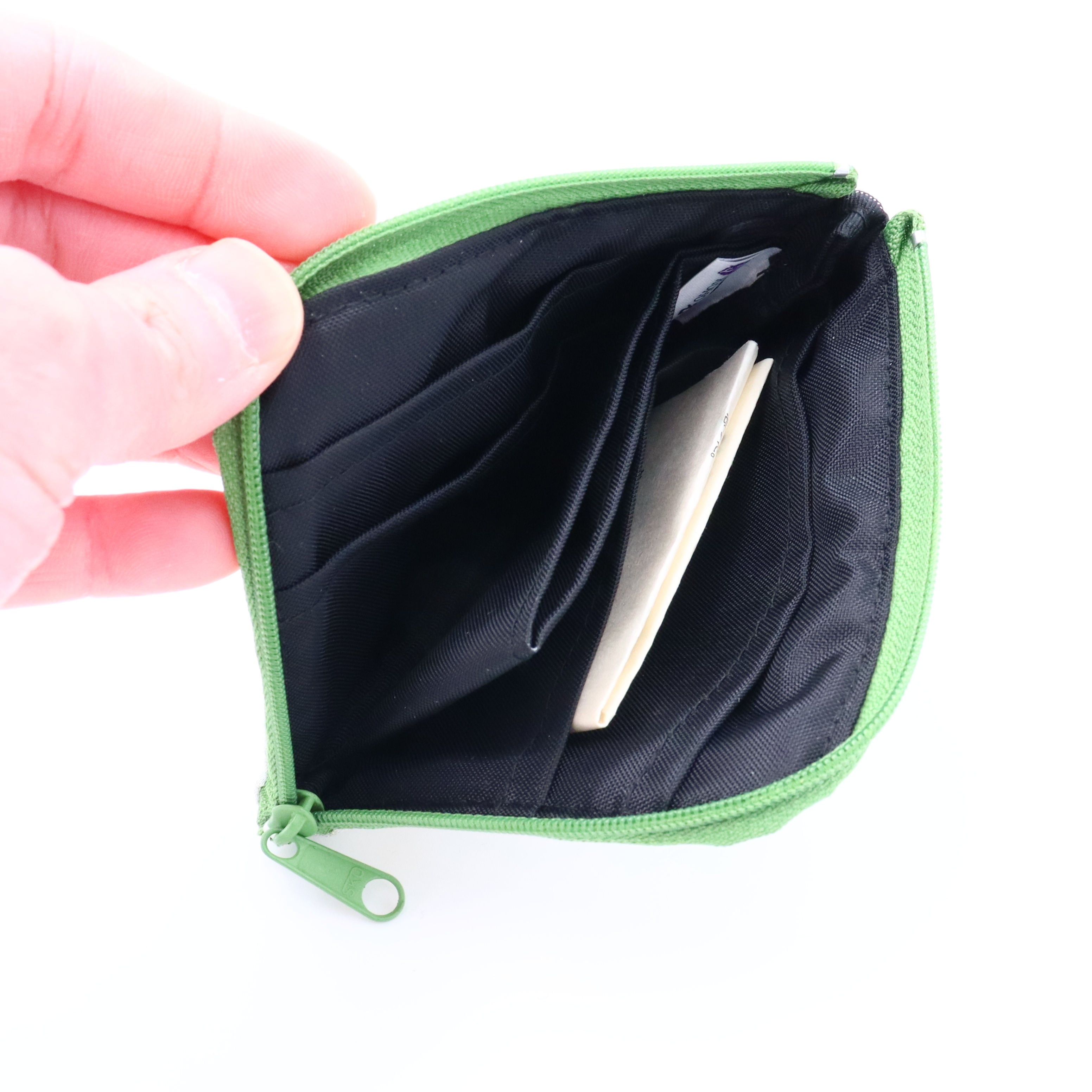 中の両側にポケット2つずつ、真ん中に仕切りポケット1つ、仕切りポケットの両側にもお札やカードなど入ります。仕切りポケットは小銭を入れたり、キーケースにもなります。