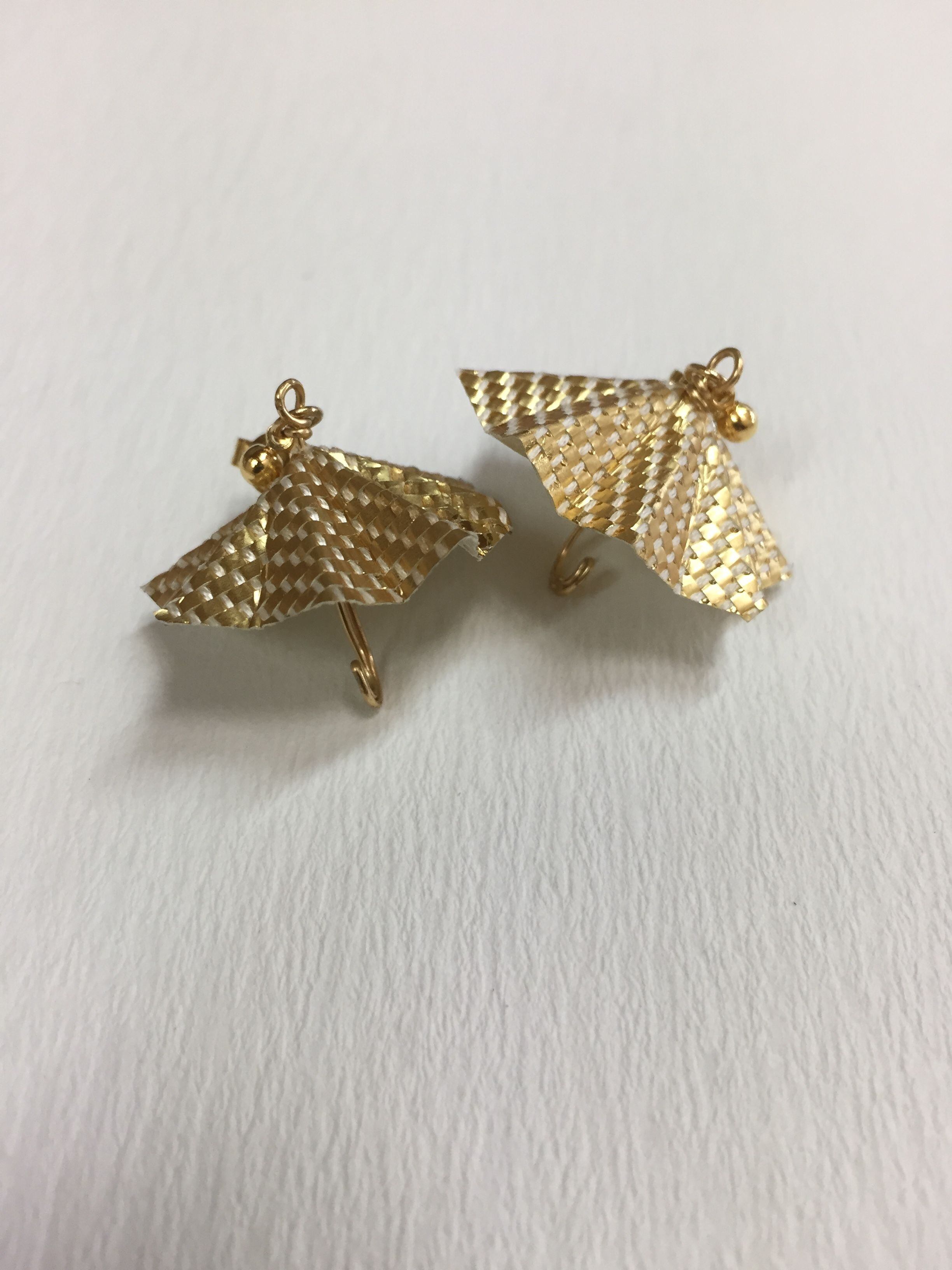 金色の箔を織り込んだ織物を、パラソルのかたちにしてピアスにいたしました。